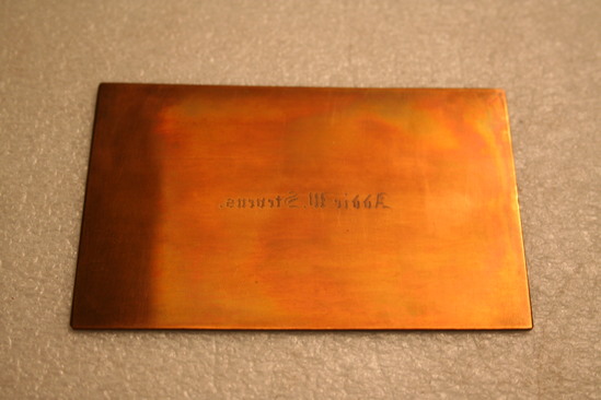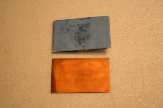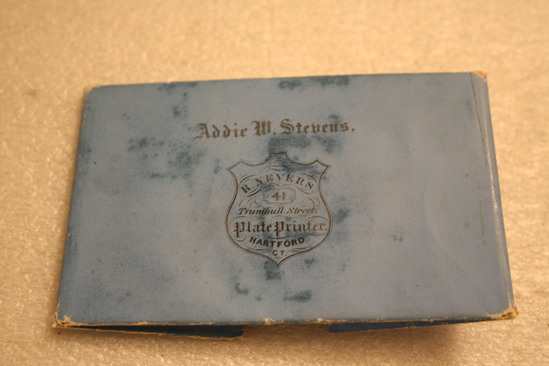 Rectangular copper plate with "Addie W. Stephens" engraved backwards across center. Blue paper wrapper with label. Label engraved on wrapper - "R. Nevers/41/Trumbull St./Plate Printer/Hartford/Ct."