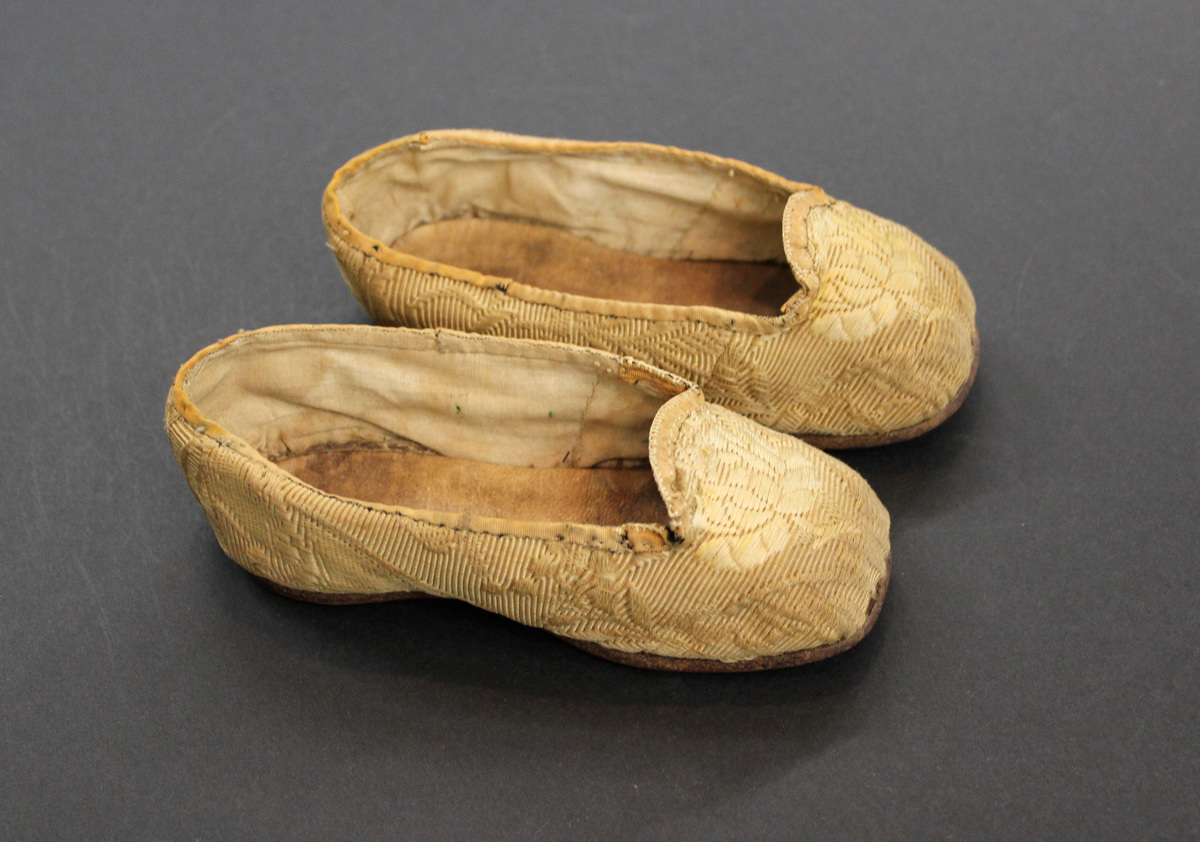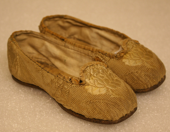 Pair of gold silk brocade child's shoes; square toes; embroidered flower in front; leather and cotton lining; . dark brown leather soles