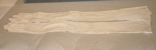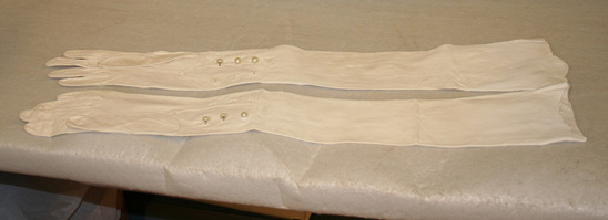 Opera length white leather gloves. Three pearl buttons at inside wrist of glove. End of glove has slightly scalloped edge.