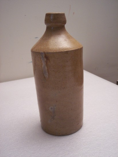 tan ceramic bottle. Very short neck with pronounced lip around edge. Glazed