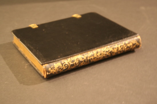 The daguerreotype case looks like a book with gold design on spine, covers have papier mache decoration - the front decorated with a branch of flowers of inlaid mother of pearl and gilt paint brushed with colored varnish. Two brass clasps. Interior - opposite side of daguerreotype lined with red velvet. Was donated with daguerreotype in case but image has been removed.