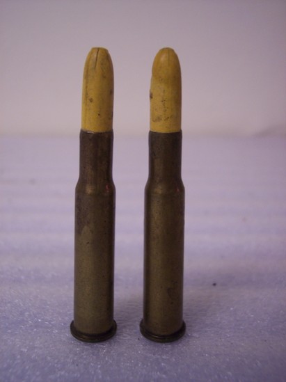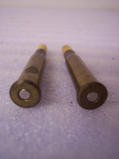 Two bullets, brass body with wood tip. Cap on bottom where gun powder poured in.