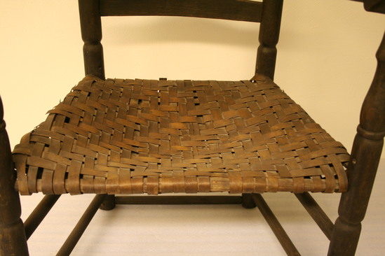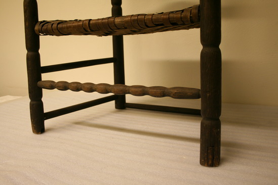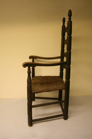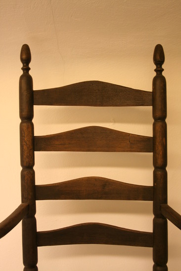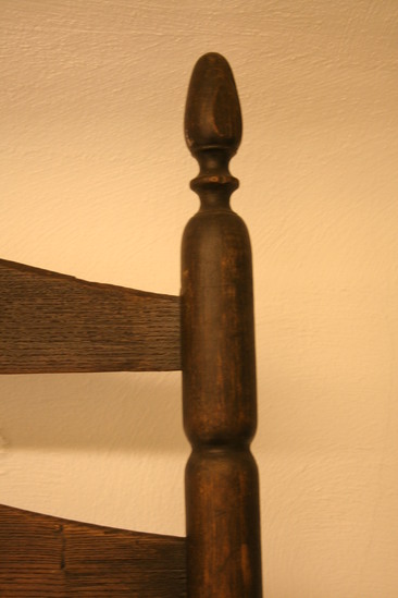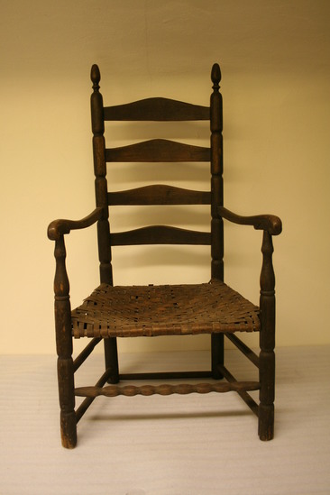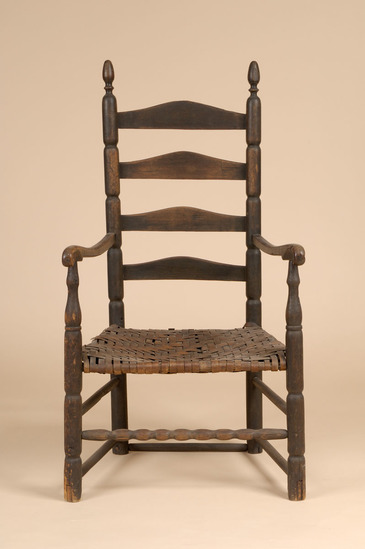 Ladder back arm chair; front legs have three long sausage turnings, ring, vase and trumpet turning to arm; sausage turned front stretchers; plain double side stretchers and single back stretcher; back leg round through seat; four sausage turnings to ring and acorn finial; four arched, curved slats in back, narrow thin arms with ends carved to form under curl with ears