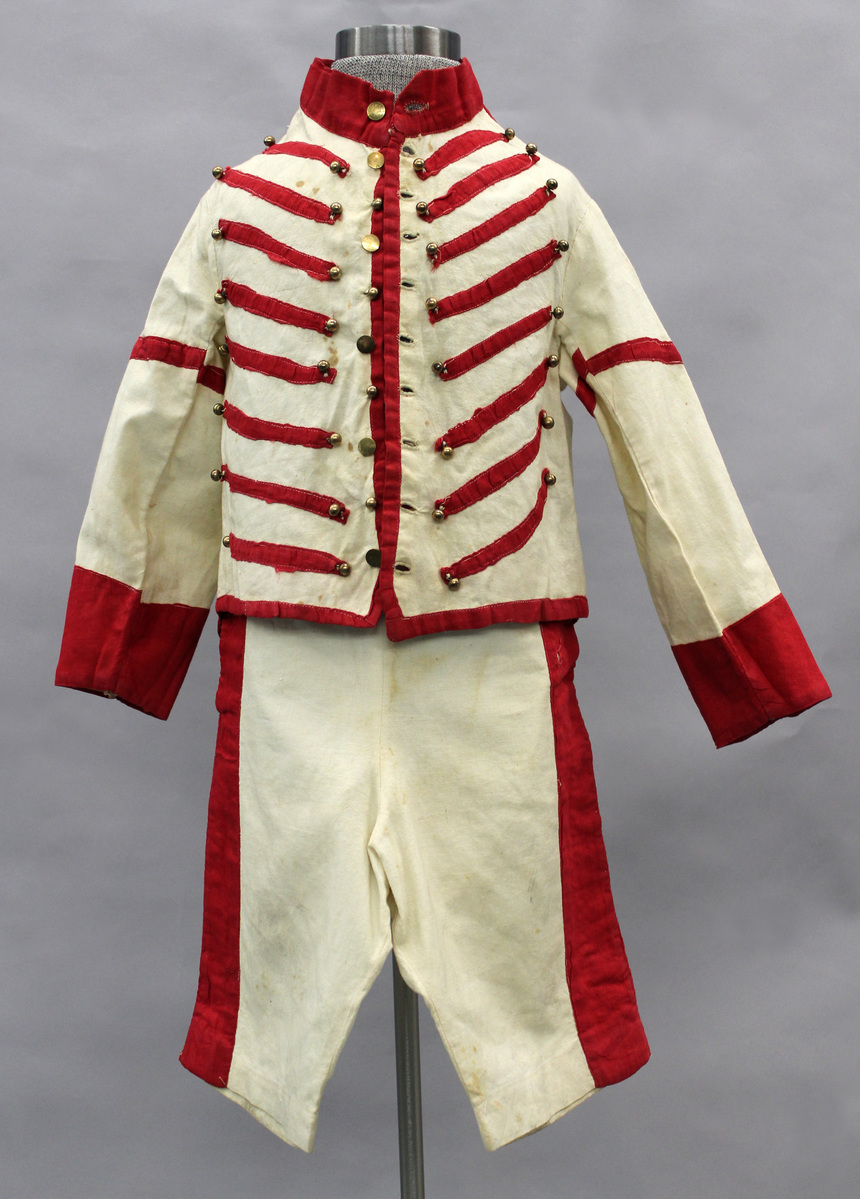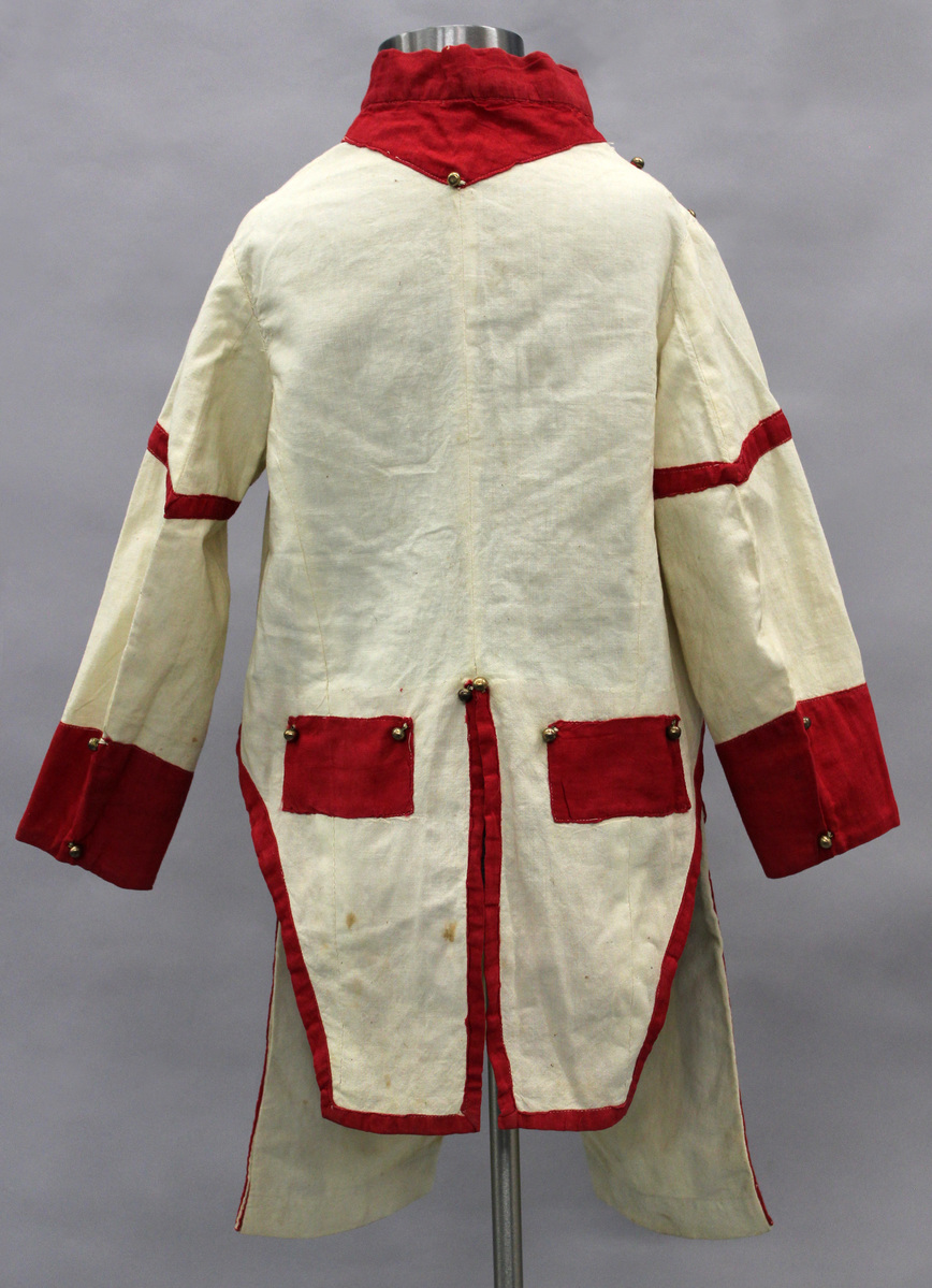 Red and white 4th of July costume - white linen with red trim; machine stitched a: Pants - fly front with red stripe down legs and at waistband; buttons at sides b: Coat - long sleeves; tails; high collar; imitation of uniform; red lining on cuffs and collar; false pockets on tails and angled decoration on front; 45 brass buttons