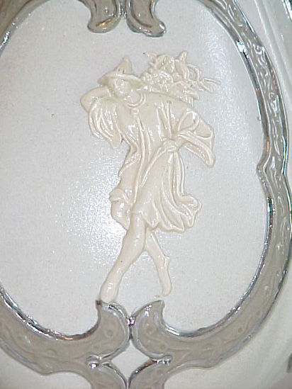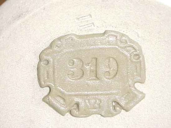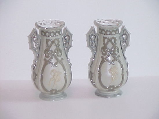 Earthenware vase created in a two-part mold with matte taupe exterior glaze. Interior is lead glazed. Vase has applied strapwork decoration in a darker taupe color outlined with a silver lustre. The lip of the vase is scalloped and pierced. The two molded handles are applied. One side has an applied figure pouring water from a pitcher in high relief. The other side features a man in Chinese costume carrying a basket of flowers on his back. His feet meet the strapwork decoration. There is a crescent shaped distinguishing mark where the exterior glaze did not completely cover the body during production. One of two identical vases, and one of a set of three matching vases.
