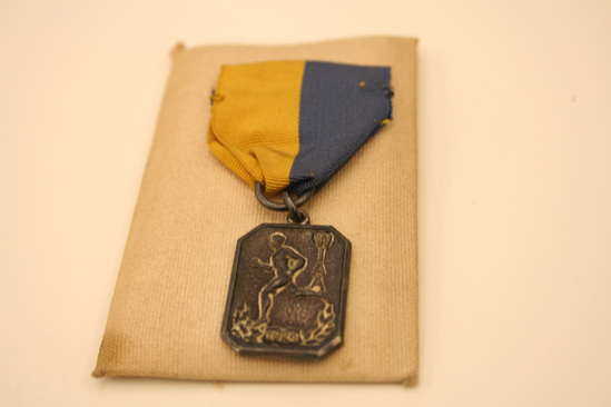 Short ribbon, half yellow, half blue (vertical bands) with pin at top on back, rectangular shaped medal at bottom. Raised image of man running, down right side - one letter under another "W/I/A/A" at bottom fo medal "1924" etched into back of medal "10 Yard Dash"