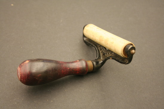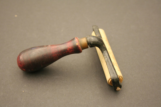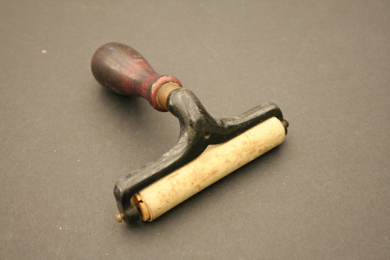 Brayer or hand roller - wooden handle - bulbous shape, stained red; brass ring at top; connected to an iron frame painted black; "G. Cennert" stamped on underside; wooden rod held between two sides of frame, connected on to ends so it can roll; covered with a thin layer of rubber
