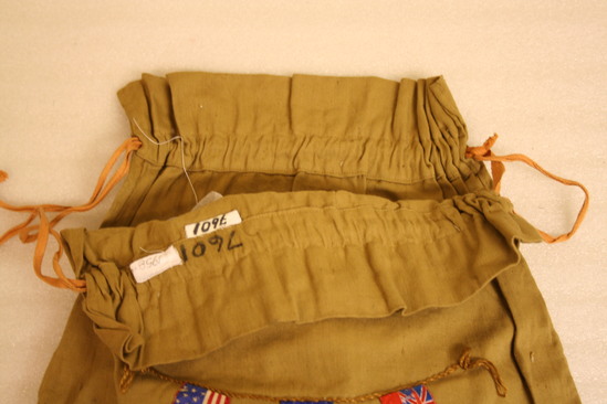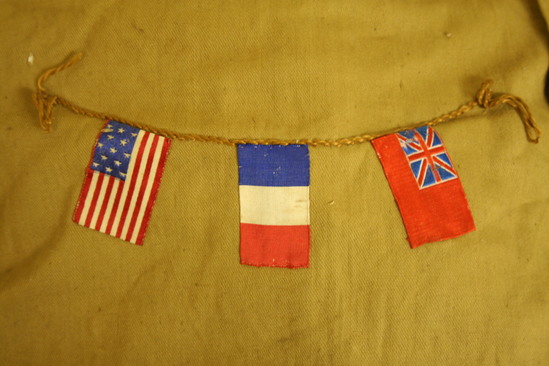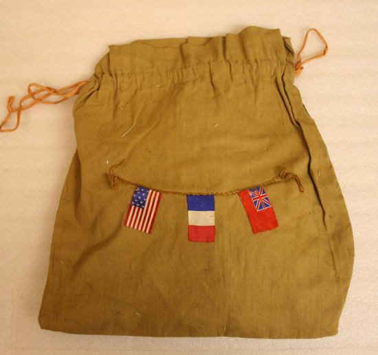 Tan drawstring light canvas bag with pink tape ties. Front decorated with three 1 3/4" x 1" ribbon flags "hanging" from an embroidered rope. Flags represent USA, France and Great Britain.