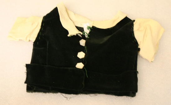 Doll's handmade vest like bodice with self belt in front of green velvet. Fastens down front with four octagonal mother of pearl buttons. Small collar and short shirred cap sleeves of ivory crinkled crepe de chine.