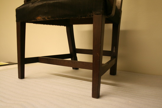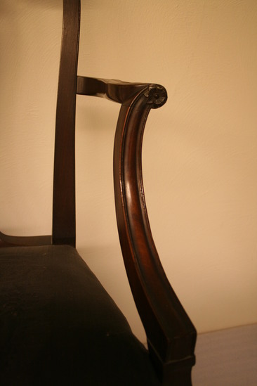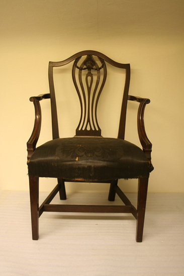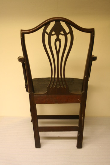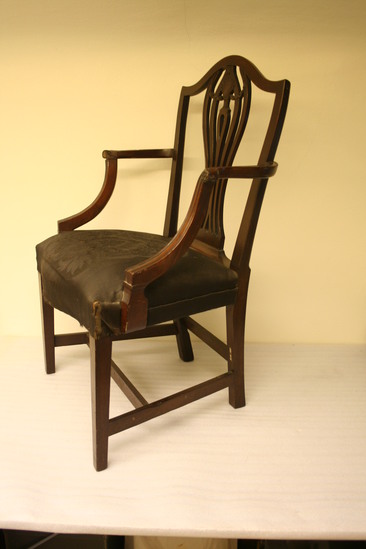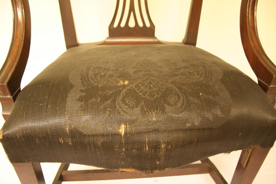 Pair of cherry arm chairs with horsehair upholstered seats; straight squared legs with back having inside champher; arms grooved and upright; flared to meet S shaped arm with roll over end and flower terminal; shield shaped back with slightly flared sides, single outside bead on edge, vase shaped splat with five members, two tear drops with center small husk pendant, leaf swag and flared reeds at top; woven roccoco horse hair seat over old linen