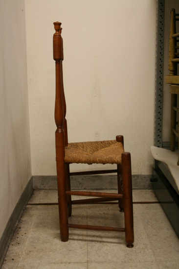 Side chair; saddle top rail; three reeded vertical, flat bannisters; plain front posts ending in ball feet and extending above seat; elongated turned back posts; single nicely turned front stretcher with two rungs on each side; new rush seat