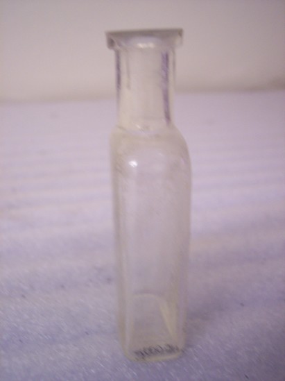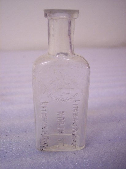 Small clear glass rectangular bottle with round neck and slightly wider collar. Rounded shoulders. One side has the words "Litchfield Pharmacy / North St. / Litchfield, Conn." and the symbol of scales inside two branches of laurel. When the bottle is standing, the words run perpendicular to the base, facing left. A maker's mark of a keystone shape with "M & Co" is on the base. All letters and symbols are raised. The words on the front of the bottle appear to have been colored at some point with black paint. Much of the paint has worn off, making the words harder to read.