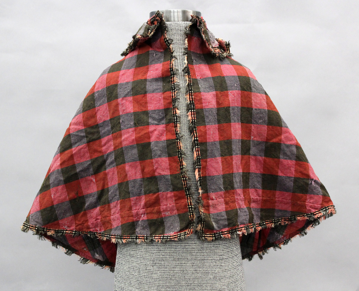 Red and black checked plaid wool child's cape; semi-circular shape; collar pointed at back and trimmed with two bands of pink and black silk fringe with two bands of black velvet; fringe around cape edge; all hand-stitched