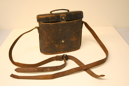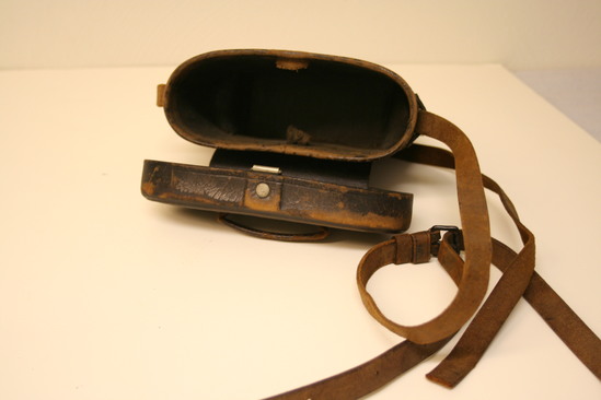 A: Binoculars - metal handles covered in black leather, eye pieces black plastic, marked dial underneath each eye piece; ridged metal disk between two handles allowing vision to be adjusted; metal disk attached with metal wire to center of binoculars; etched into disk "Donated to U.S. Navy/F.K. Bull/Litchfield/Conn./1192" B: Case - leather case with long leather strap; metal buckle allowing strap to be adjusted; leather handle on lid of case; lid hinged on one side; elongated oval in shape; interior of case shaped to hold binoculars