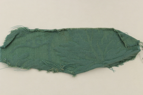 Rectangular fabric swatch made of silk. Green with a raised leaf pattern at the top. Swatch has a fairly open weave and is rough to the touch.