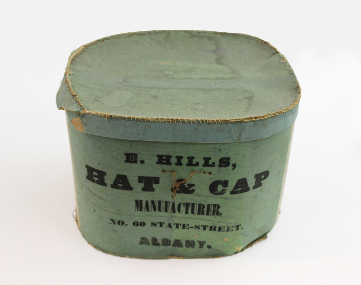 Bandbox with blue paper cover, sides have a blue and white foliated design on grey ground. Label takes up one side. Hand sewn.