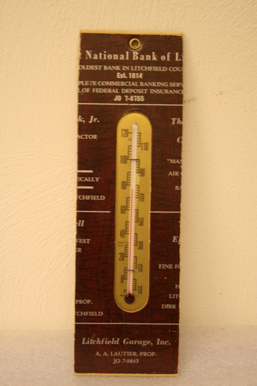 Cut down advertising board with thermometer in center. White lettering on wood grain background. At top is the First National Bank of Litchfield, and at the bottom is the Litchfield Garage.
