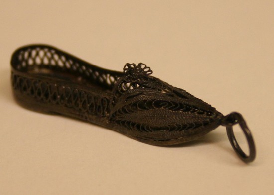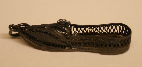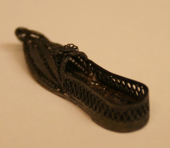 Silver filagree pendant in shape of lady's shoe. Ring of metal attached to toe of shoe
