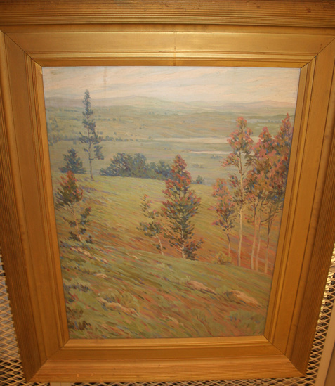Oil on canvas landscape painting painted from hillside vantage point overlooking a valley to distant mountains with estuaries of the Pacific Ocean on the right. Label: "Carnegie Institute, Pittsburgh, U.S.A. Shores of the Pacific/Adelaide Deming/Litchfield, Connecticut."