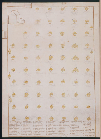 Paper, pen and watercolor map of Julius Deming's orchard. Depicts rudimentary barn with gates and fence in upper left corner. The rest of the map has drawings of fruit trees with numbers and the names penciled in. There is a legend at the bottom in 7 columns. Produced by Clarissa Deming, daughter of Julius Deming, North Street, Litchfield, CT.