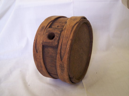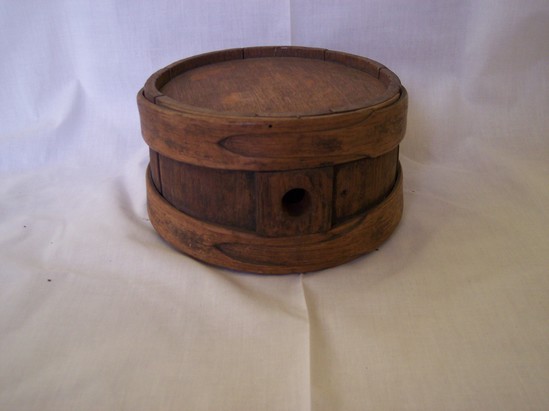 Made of 8 pieces of curved oak butted together, with flat round oak sides fitted into inside grooves. It is bounded with two hickory bands 1 5'8" wide top and bottom, which are spliced with large tongues and grooves. One side piece has square block with 3/4" hole drilled in it. Has wooden shims.