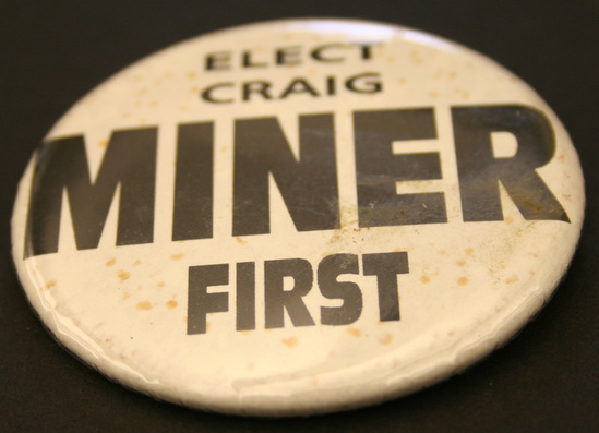 Election/Campaign button. Flat circle, laminated white paper with black block lettering "Elect/Craig/Miner/First." Mounted on aluminum button with brooch pin closure on back. Made for Craig Miner's campaign for First Selectman of Litchfield.