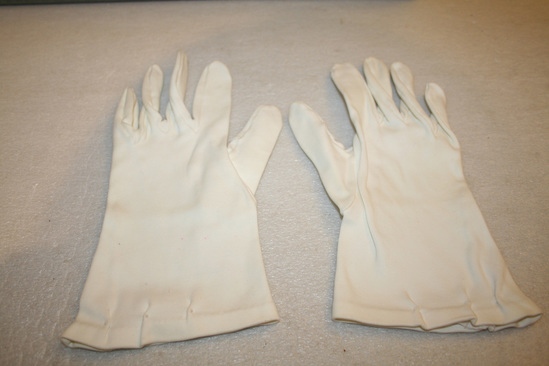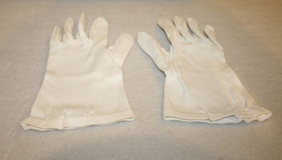 Pair of woman's white glvoes. Dress gloves, end at the wrist. Stamped on inside left hand glove "Christian Dior/Sea Island/100% lavable/7" 3 pleats on outside wrist of each glove
