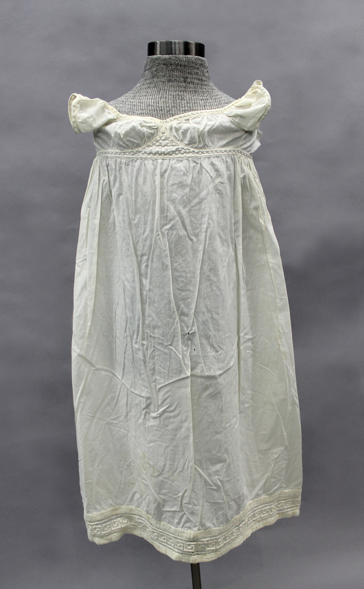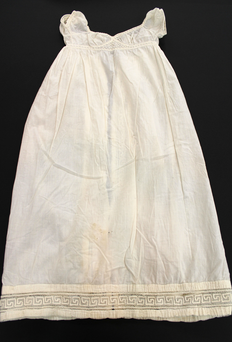 White cotton child's dress; short puff sleeves with embroidery; high waist; scoop neckline with embroidery; Greek key design along hem and at center back; drawstrings at top and bottom of bodice