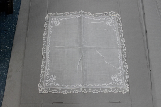 White linen handkerchief, material thin, almost transparent. Lace trim on all sides. Floral embroidery in each corner with border along each side. Drawn work lines under embroidery.