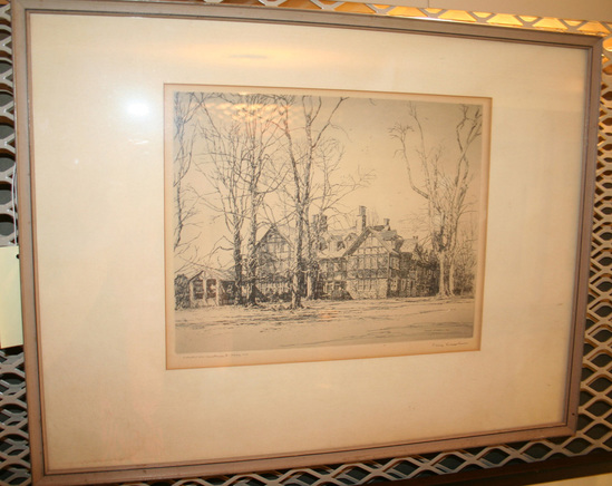 Etching showing the east front of the Half Timbered Stong and Stucco mansion build in High Tudor Revival Style. The east elevation shows a center block of 2.5 stories with three Dormers facing east. There is a garden entrance on the first floor. The Mansion is sited in a grove of large deciduous trees on a level lawn. These have been rendered sans foliage to emphasize the architectural importance of the building. Inscribed on back in ink "Kilravock/Brush Hill Road/Litchfield/Built 1906 for Louis H. Ripley/Etching by Philip Kappel/Donated by Louis R. Ripley/June 5, 1981" Large white mat board with simple wooden frame.