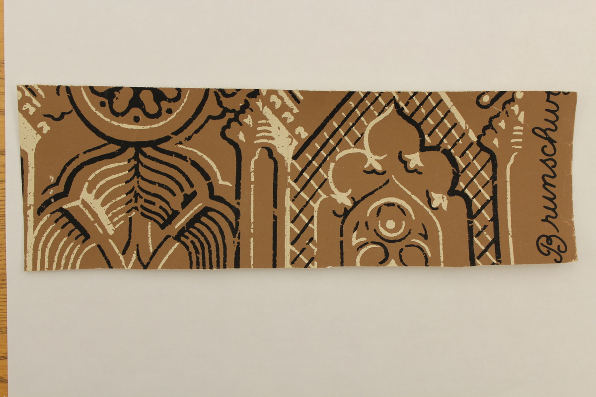 Rectangular piece of wallpaper sample. Wallpaper is brown with a black and white design of houses/churches. Design is simply outlined with the black and white lines. Sample is smooth to the touch. Marks: Stamp wit manufacturer name and style number.