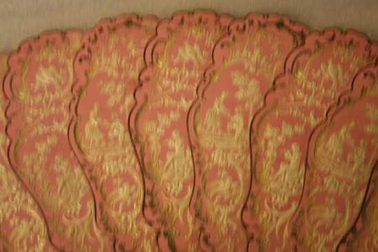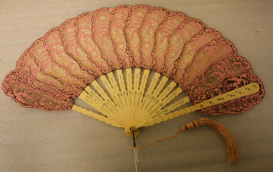 Fan made of pink paper embossed in silver with fragonard type rococo pastoral scenes in cartouches and floral decoration. Paper glued to ivory sticks with pierce decoration. Metal ring at base of fan with pink silk tassel.