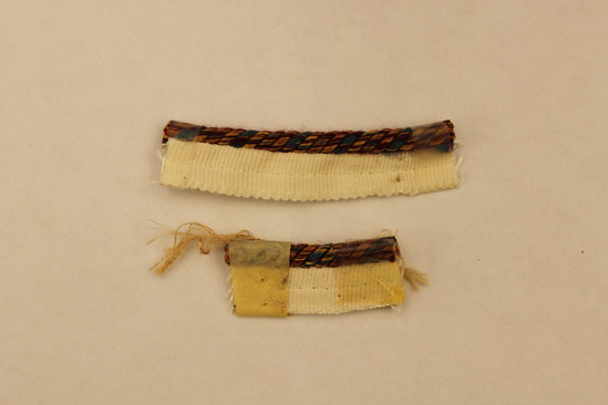 Rectangular strip of trim with yellow, maroon, brown, and teal thread twisted into rope and attached to strip of white fabric. Fabric has an open weave and is rough to the touch.