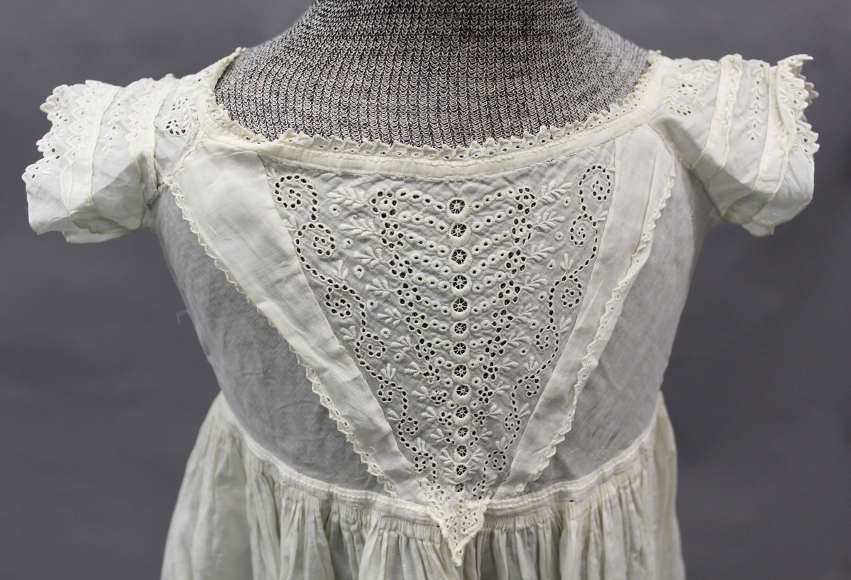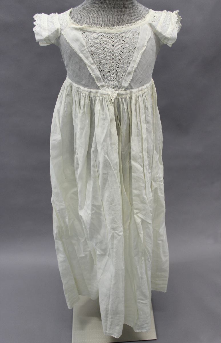 White cotton child's dress; short sleeves with white work and embroidered lace; scoop neck; front bodice on bias with white work and needle fillings; tucks and embroidered lace at hem; back bodice with neck ruffle; drawstrings at neck and waist