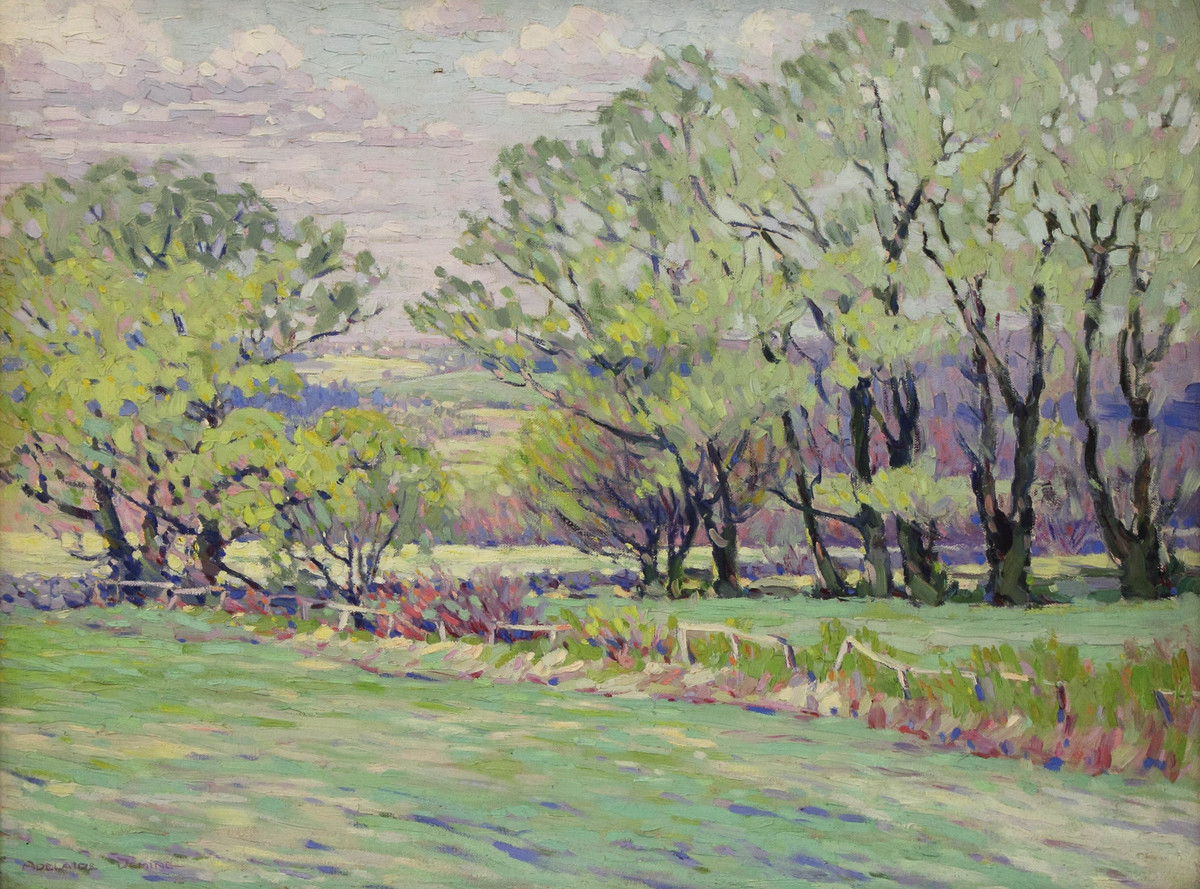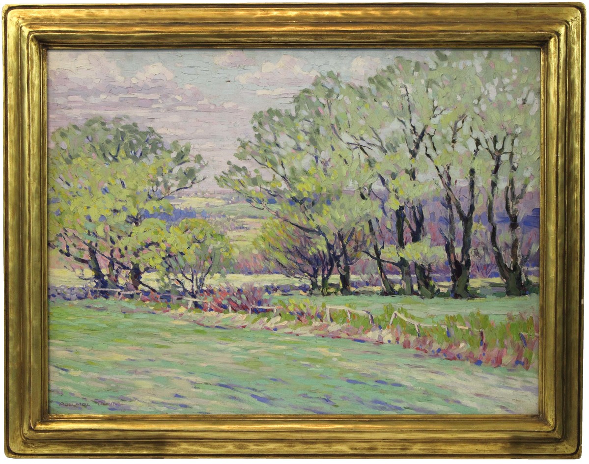 An oil on canvas landscape painting featuring a meandering stream cutting through a meadow, along the banks are willows and fresh olive leaves, all in strong sunlight, hills in the background. Painted in Litchfield, location unknown. Signed lower left: "ADELAIDE DEMING" Label on back: "Willows in Spring/Rec'd Honorable Mention/at exh. of Connecticut Academy."