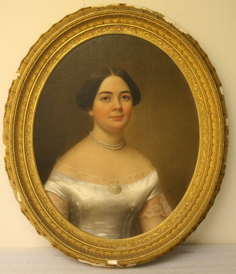 Oil on canvas 1/2 length oval portrait of Mrs. John W. Quincy, Lucretia Deming Perkins, (1832-1883) as a young woman, turned to the right, brown hair parted in the middle, brown eyes, wearing a white silk dress, worn off the shoulders with lace trim around neckline and short sleeves, two strand pearl choker and pearl brooch at decoulege line, painted by Charles Osgood in Salem, Mass. in 1856, when Lucretia was 24 years old.