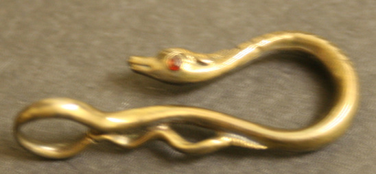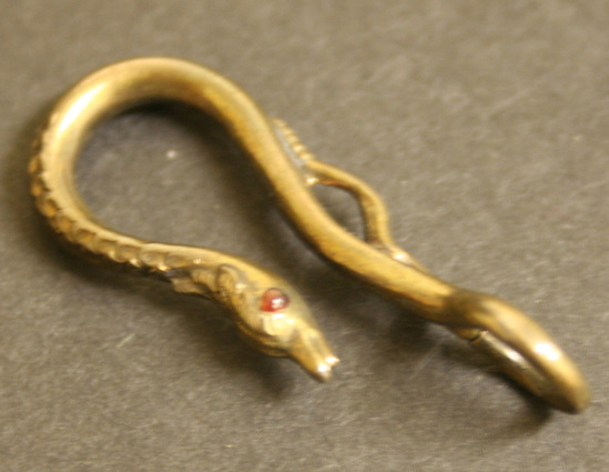 Hook for a man's watch chain. Bronze. Ring at base. Hook is sculpted in the form of a snake with small garnet stones for eyes.