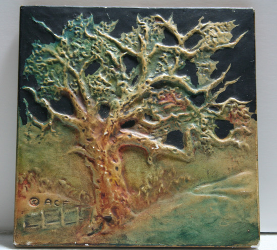 Square ceramic tile. Black sky with tree, grass, and fence relief in shades of green and brown. "COPYRIGHT, 1848/ ALICE CRANSTON FENNER/ LITCHFIELD, CONN." stamped on back of tile.