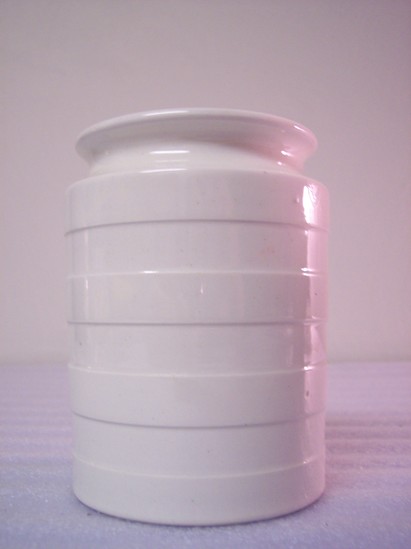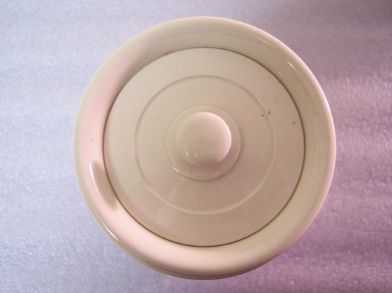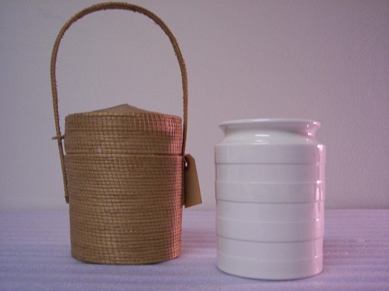 Jar is white with a cylindrical body with 4 equal sized horizontal raised bands. Concave neck, flared rim. Lid is flat and round with a set-in knob or button finial. Case is made of coiled straw. Cylindrical with slightly pointed top. Loop from one side of top attaches to inverted u-handle and other side has sewn loop hooking over sewn knob attached to top of the bottom section. Case from India?