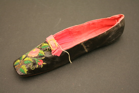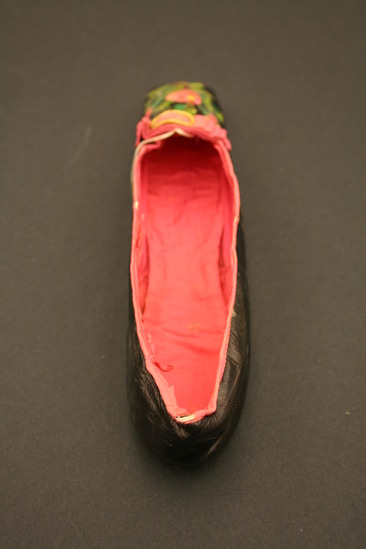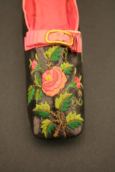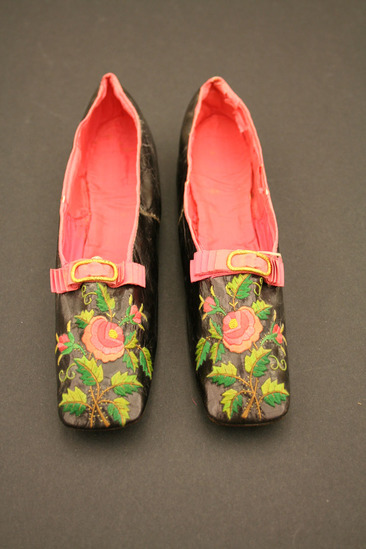 Black leather shoes, pink silk tape binding over drawstring; pink satin lining; embroidered flowers on top in pink, green, yellow and brown silk thread; pink silk tape folded ribbon with brass metal buckle on top of toe; leather sole
