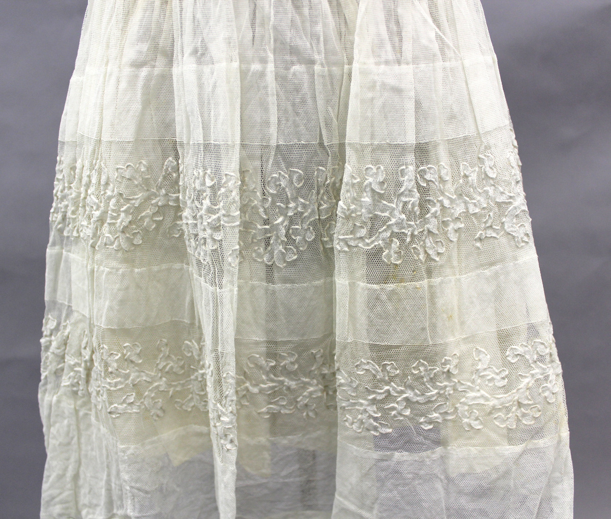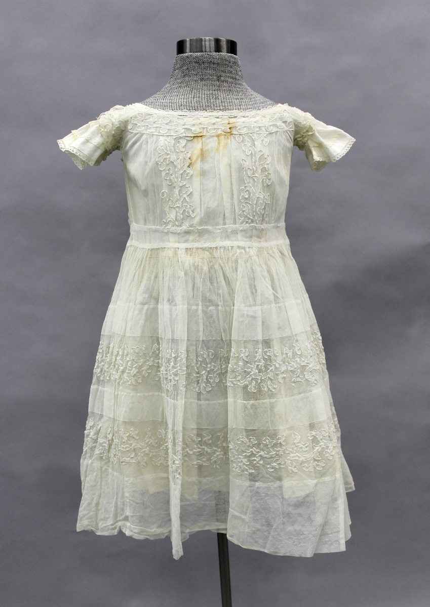 a: Dress: white cotton embroidered net dress; short sleeves trimmed with narrow bands of tatting; off the shoulder gathered neckline; corded waist with gathering above and below; wide hem b: Underdress; white cotton; gathered waist and neckline; buttons; short sleeves with eyelet lace