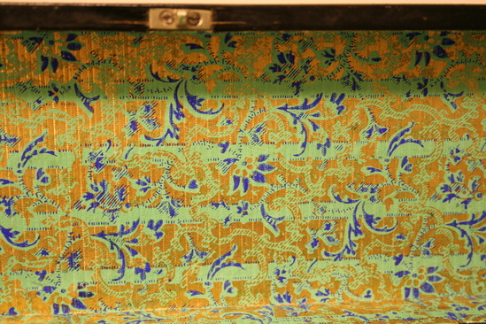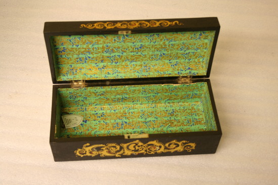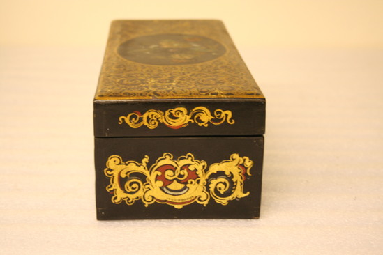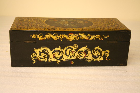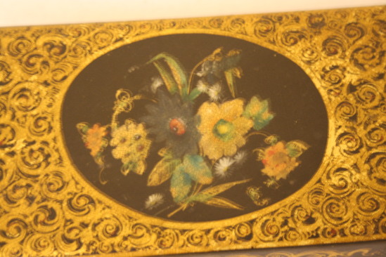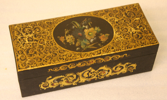 Oblong work box with lobate curved sides and 1/4" base. Black japanned work finish. Front has gilt and painted flowers with mother of pearl inlay for buds. Star shaped silvered key plate. Top inlaid with random chips of mother of pearl with gilt circles between. Crude square painting of flowers with round corner, pale green background with spray of dark flowers. Interior top - red and gilt paper lined sides, mock tortoise shell frames to mirror having C & S scroll cut out. In bottom - work tray lifts out. Tray has gold paper with gilt dots on bottom. Sides and interior covered with gold and blue printed pink paper embossed to give texture. Two brass handles on side. Six compartments open in front from red plush fitted covers to five compartments with smaller open ones in center. Ivory knobs on two tops. Interior bottom lined with gilt and red printed paper.