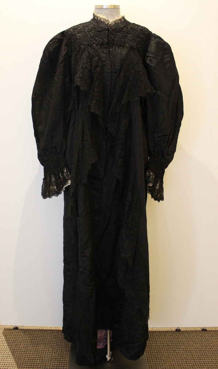 Black silk mourning dress. Square yoke with embroidered lace. Chantilly lace ruffle down center-front sides. Eleven covered buttons for closure at front. Full sleeves with lace ruffles at cuff. Band collar with ruffles. Blonde Valenciennes lace ruffle at neck and cuffs. Pin tucks on back. Short train with black velvet ribbon facing. Lavender silk lining. Ribbon ties attached at waist.