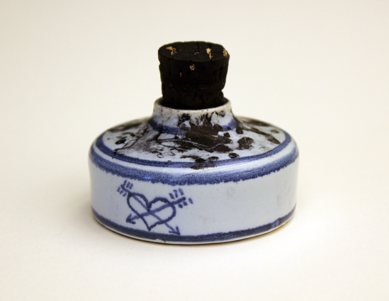 Small, squat inkwell. Light blue glaze on exterior and interior - bottom unglazed. Four rings of darker blue glaze decorate the outside of the inkwell. Heat and arrows design on one side.