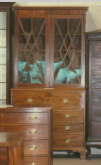 Desk and bookcase. Bookcase on glass doors with wooden moldings intersecting at angles to create a diamond pattern across glass. Four shelves inside bookcase. Desk has three drawers. The top "drawer" which is the widest folds down into a butler's desk. Smaller drawers and cubby holes line inside of desk. Felt lining on desk top. Bracket feet.