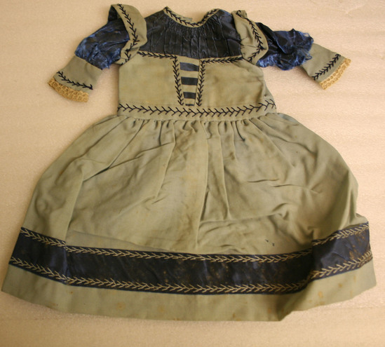 Doll's dress - light blue serge with dark blue silk pleated guimpe and sleeves and wide band around bottom of skirt. Feather stitching on sleeves, bodice and skirt in blue and white. Machine stitched.