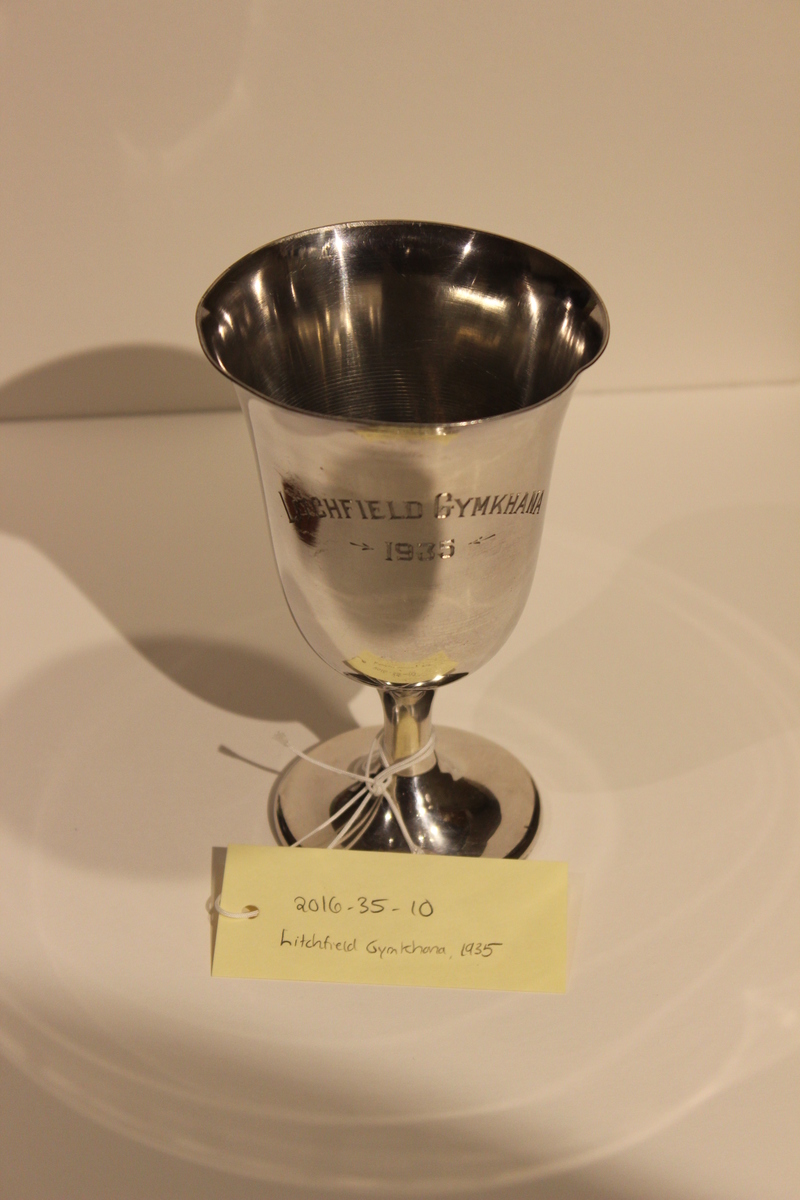 Sterling silver or silver plate goblet-style trophy, engraved on front "LITCHFIELD GYMKHANA/1935." Engraved on bottom "THE MERWIN-WILSON _____/NEW MILFORD, CONN./72."