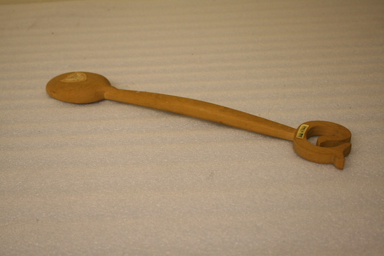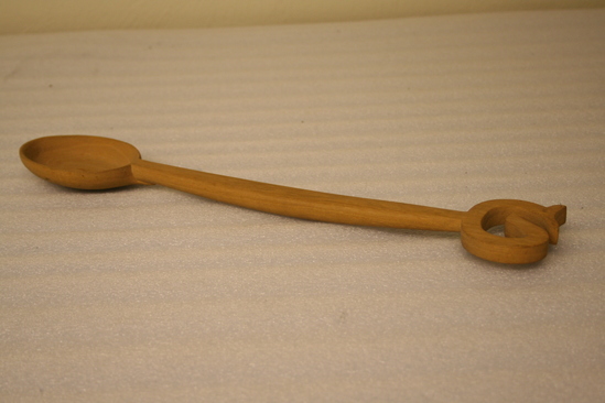 Wooden spoon with shallow bowl. Flattish handle ending in a carved ornament