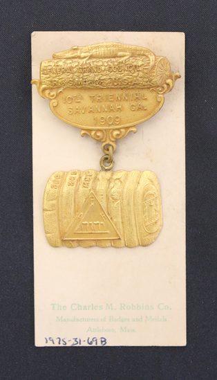 Gold Masonic medal. Top of medal cast to look like a log with an alligator lying on it. "GENERAL GRAND COUNCIL / R. & S.M. of U.S.A" on log. "10TH TRIENNIAL / SAVANNAH GA. / 1909" below log. A piece shaped like a trunk hangs below. Trunk decorated with Masonic symbols and Hebrew lettering. "ROBBINS CO / ATTLEBORO / MASS" stamped on back of medal. Medal pinned to a cream-colored stiff card. "The Charles M. Robbins Co. / Manufacturers of Badges and Medals / Attleboro, Mass." stamped in green at the bottom.