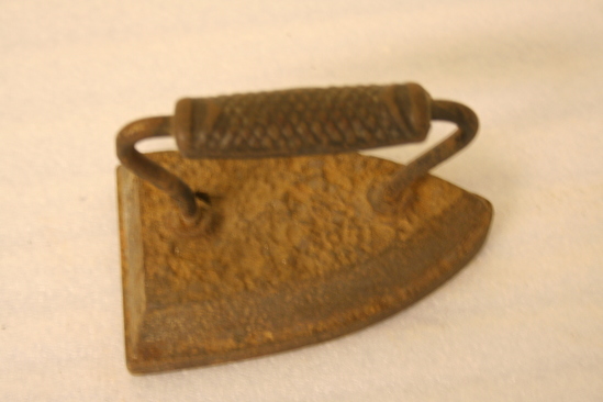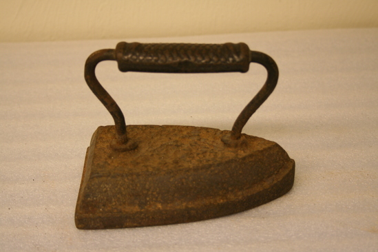 Thick, triangular shaped body. Curved C shaped handle with thicker area in middle